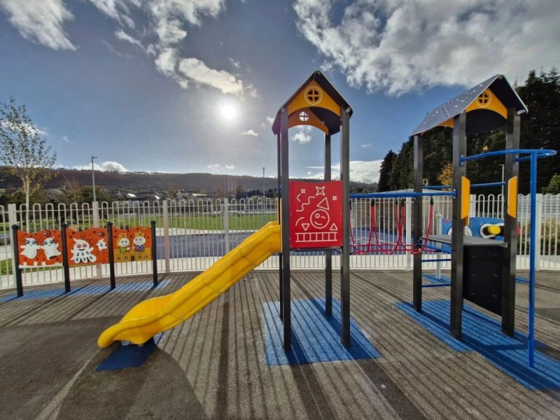 Two towers playground set with a slide, climbing walls, and a rope bridge for kids age 3 - 6. A set with vivid colours and with finger patterns that encourage children to play and explore. The construction is made of black steel, protected against corrosion, resistant to weather conditions, and intensive use. The platform is made of HPL with non-slip texture. Thanks to this solution the floor is soft (more safety) and it is not heating during sunny days and it is not freezing during the winter.