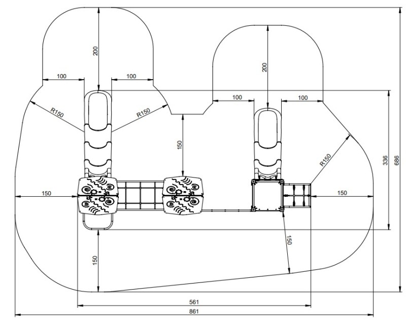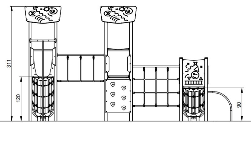 Construction consists of pipes with a square profile. Platform made of HPL material. Walls made of HDPE material with a thickness of 12mm. A slide is made of colorful, durable PE material that does not heat up. Nuts and washers are made of stainless steel. Rope climbing net and bridge made of 16 mm polypropylene rope with a steel core.