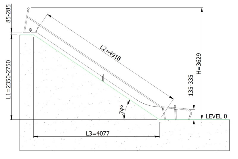 - Polished slide made entirely of stainless steel AISI 304 (1.4301) with a sheet thickness of 2 mm and a profile of 33.7 × 2 mm