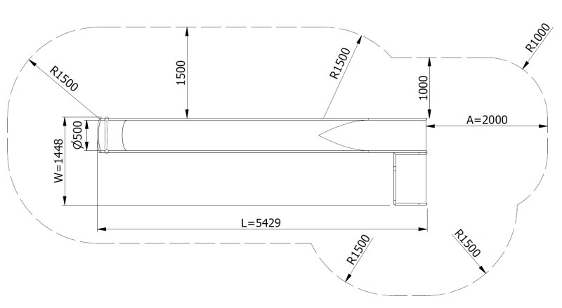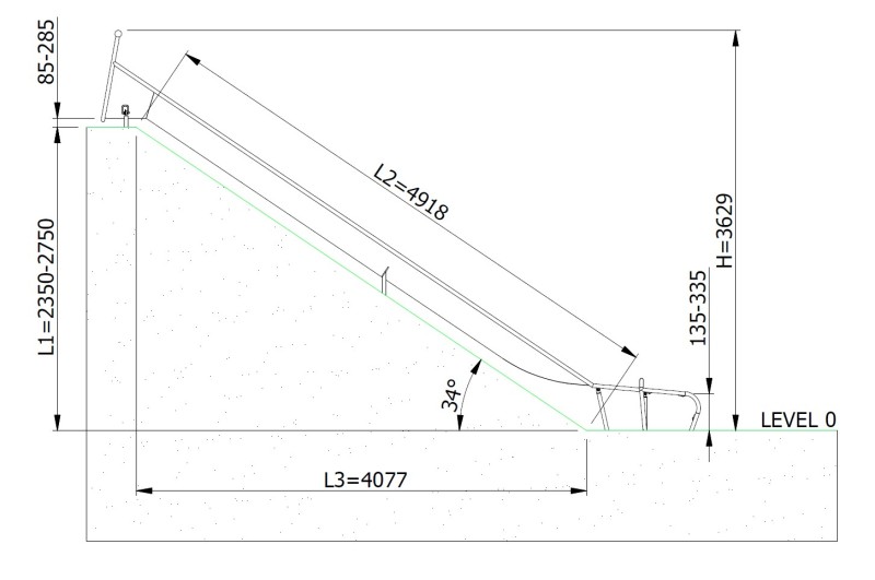 - Polished slide made entirely of stainless steel AISI 304 (1.4301) with a sheet thickness of 2 mm and a profile of 33.7 × 2 mm