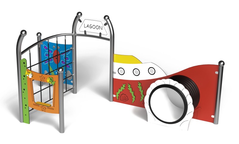 The Port Playset is an attractive playground feature that combines fun, learning, and creativity, designed to be accessible for children using wheelchairs. Children can take on the roles of sailors or fishermen, developing imagination, motor skills, and teamwork abilities. The set stands out with its realistic appearance – featuring a gate with the inscription “Lagoon,” a panel with fish and a counter, a tunnel, a climbing wall, a ship, and a lighthouse. Made from durable and safe materials, it becomes the centerpiece of play and adventure on any playground. Additional rotating wheels that emit colorful light in motion make play even more engaging and dynamic. The Port Playset is ideal for kindergartens, recreational areas, and playgrounds, supporting sensory development and stimulating children’s creativity.