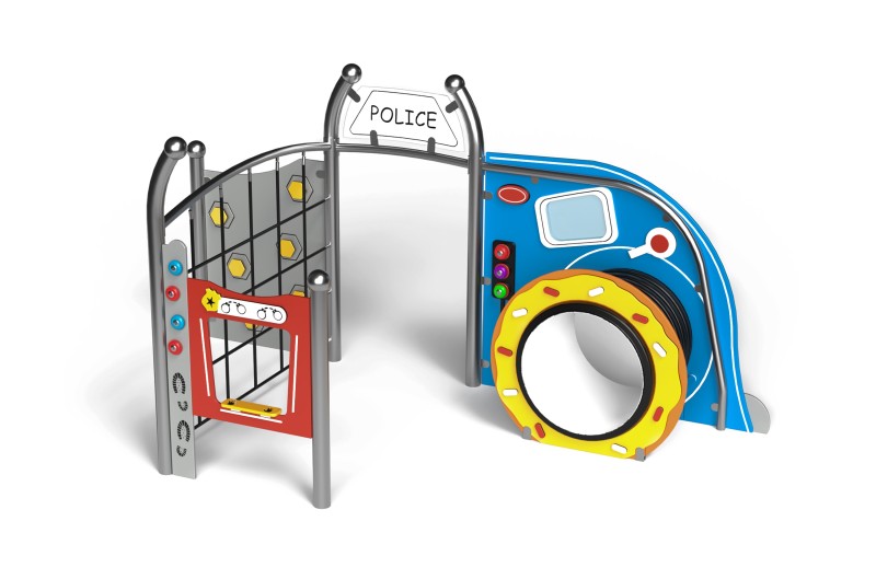The Police Station Playset is a unique playground element that combines learning with creative role-playing, designed for children using wheelchairs. Children can become police officers, go on patrols, respond to “calls,” and develop their imagination, coordination, and teamwork skills. The set attracts attention with its realistic appearance – featuring a gate with the “POLICE” sign, a police panel with a counter, a tunnel, climbing walls, and a patrol car. Made from durable and safe materials, it serves as a hub of fun and adventure on any playground. Additionally, built-in rotating wheels that emit colorful light in motion make play even more exciting. This set is ideal for kindergartens, recreational areas, and playgrounds, supporting sensory development and fostering creativity in young children.