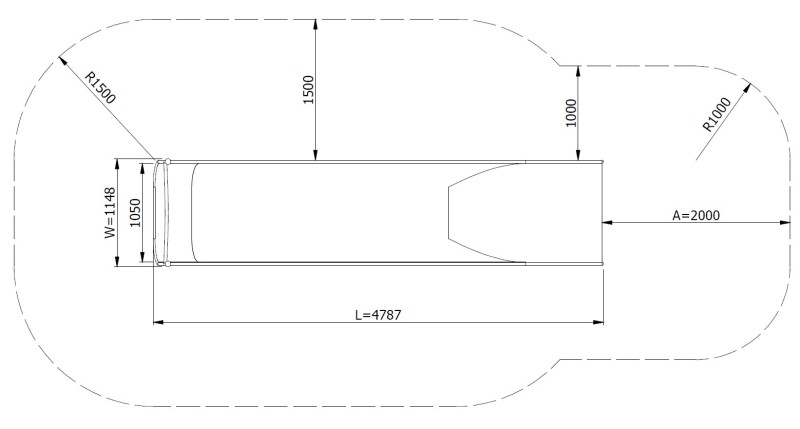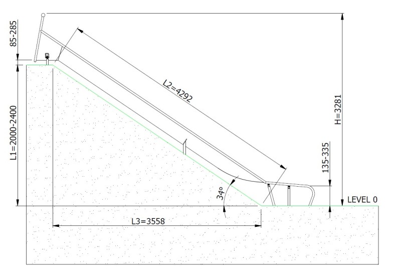 The ELIRI H2400 wide embankment slide consists of a straight trough-shaped slide enabling a safe descent. The structure is supported by six foundation legs made of stainless steel, ensuring high strength, complete corrosion resistance, as well as stability and durability of the entire unit. The slide is made entirely of stainless steel AISI 304 (1.4301), with a sheet thickness of 2 mm and a 33.7 × 2 mm profile; the surface is bead-blasted, weather-resistant, and easy to maintain. The upper part of the slide is equipped with a handrail that facilitates entry and provides additional safety during the start.