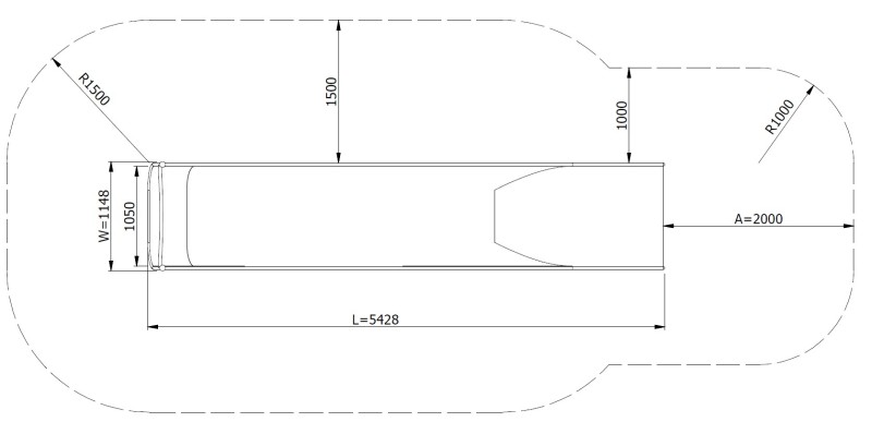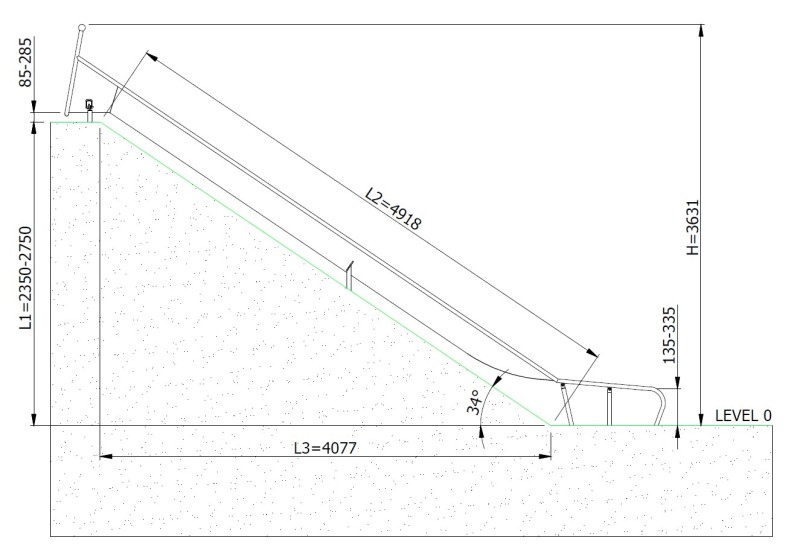 The ELIRI H2750 wide embankment slide consists of a straight trough-shaped slide enabling a safe descent. The structure is supported by six foundation legs made of stainless steel, ensuring high strength, complete corrosion resistance, as well as stability and durability of the entire unit. The slide is made entirely of stainless steel AISI 304 (1.4301), with a sheet thickness of 2 mm and a 33.7 × 2 mm profile; the surface is bead-blasted, weather-resistant, and easy to maintain. The upper part of the slide is equipped with a handrail that facilitates entry and provides additional safety during the start.
