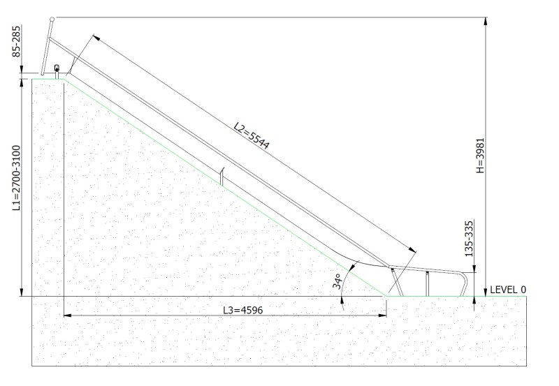 The ELIRI H3100 wide embankment slide consists of a straight trough-shaped slide enabling a safe descent. The structure is supported by six foundation legs made of stainless steel, ensuring high strength, complete corrosion resistance, as well as stability and durability of the entire unit. The slide is made entirely of stainless steel AISI 304 (1.4301), with a sheet thickness of 2 mm and a 33.7 × 2 mm profile; the surface is bead-blasted, weather-resistant, and easy to maintain. The upper part of the slide is equipped with a handrail that facilitates entry and provides additional safety during the start.
