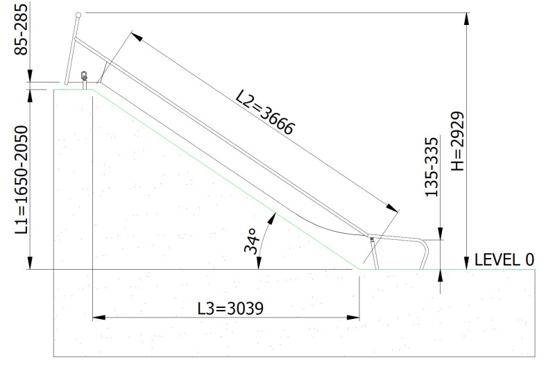 The GLITI H2050 narrow embankment slide consists of a straight trough-shaped slide enabling a safe descent. The structure is supported by three foundation legs made of stainless steel, ensuring high strength, complete corrosion resistance, as well as stability and durability of the entire unit. The slide is made entirely of stainless steel AISI 304 (1.4301), with a sheet thickness of 2 mm and a 33.7 × 2 mm profile; the surface is bead-blasted, weather-resistant, and easy to maintain. The upper part of the slide is equipped with a handrail that facilitates entry and provides additional safety during the start.
