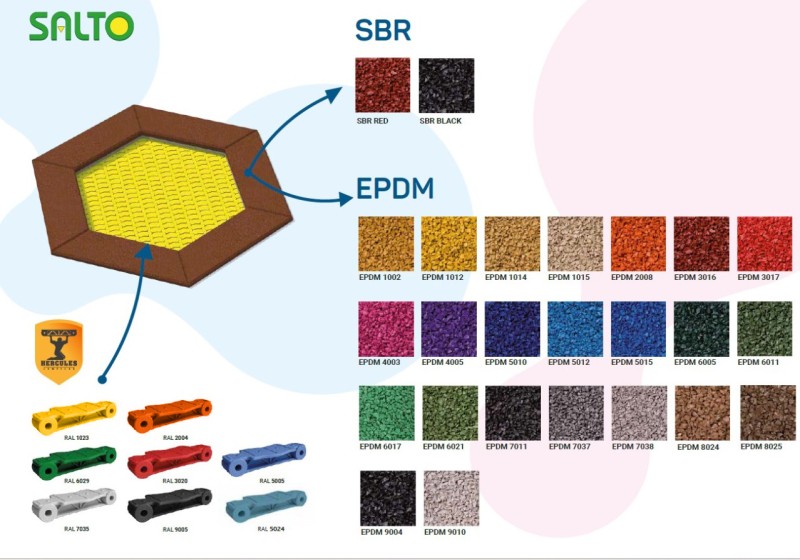 Round shaped trampoline intended for use on playgrounds with intensive use. Jumping mat is made of very durable Hercules lamellas with a width of min. 37 mm, having the shape of the letter "V" and reinforced by ribs. Thanks to the unique shape of the lamellas, the spaces between the mat elements have been reduced to only 7 mm, which prevents small objects, such as keys or mobile phones, from falling into the trampoline. The mat is available in 8 colours, it is also possible to make graphics on the mat. The rubber trampoline collar is available in 2 standard colours and 23 special colours. Additionally, a decorative pattern can be made on the collar. The trampoline can be equipped with openable cover that makes it easy to clean inside.