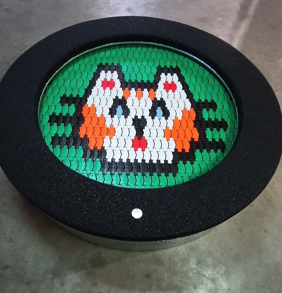 - The trampoline mat features an image of a cats. The mat is made of slats in black, orange, red, gray, green, and light blue colors,